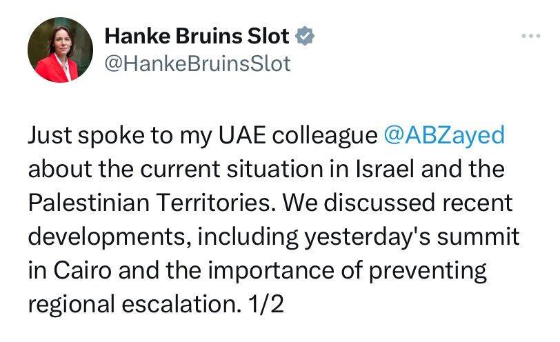 Hanke Bruins Slot, Dutch Minister of Foreign Affairs, has spoken to her colleagues from Egypt, Jordan and Saudi Arabia on Sunday. They discussed potential international efforts to prevent further escalation in Israel and the Palestinian Territories.