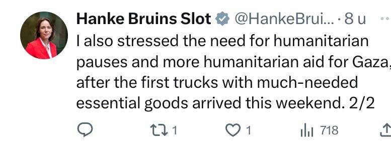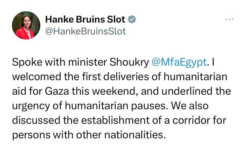 Minister of Foreign Affairs Hanke Bruins Slot spoke with her colleagues in Egypt and the United Arab Emirates on Sunday evening. The minister wrote this on X. Bruins Slot spoke, among other things, about establishing a so-called 'corridor' through which aid to Gaza, such as food and water, can be delivered from Egypt.