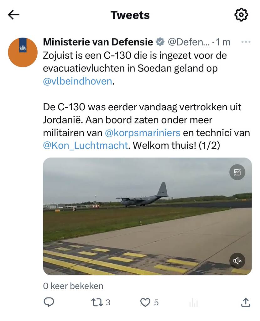 The ministry of Defense reports on Thursday night that the C-130, the plane used for evacuations in Sudan, has returned to the Netherlands.