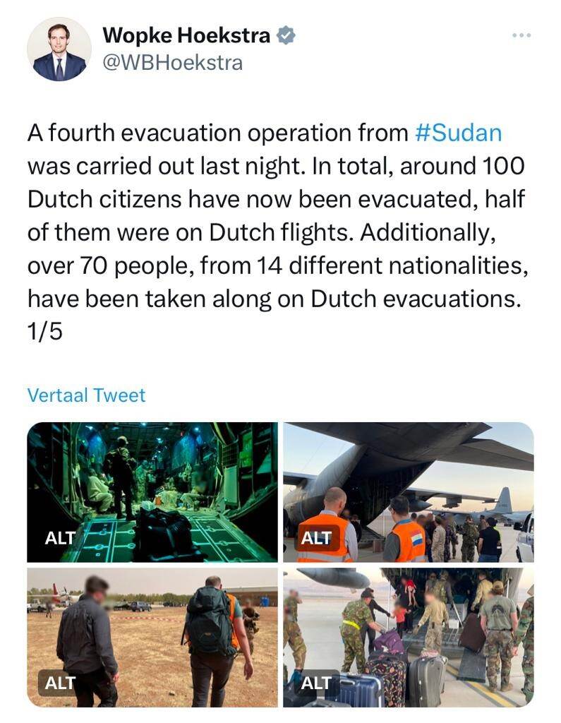 Minister Hoekstra on Twitter: 'Over the last three days, the Netherlands has completed six evacuation flights from Sudan. At least 150 Dutch citizens have left the country safely, over 70 on Dutch flights. These flights also carried around 100 people from 18 different nationalities. Yesterday we welcomed the first 104 evacuees in Eindhoven, an emotional moment. Later that evening, 43 Dutch people arrived by bus from Germany. None of this would have been possible without the help of our international partners. I have great admiration for Foreign Affairs and Defence colleagues, who continue to work day and night supporting evacuees and bringing them to safety.'
